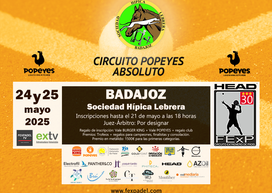 4ª PRUEBA CIRCUITO PADEL ABSOLUTO POPEYES EN BADAJOZ TROFEO SOCIEDAD HÍPICA LEBRERA 2025Los próximos 24 y 25 de mayo, las instalaciones de la Sociedad Hípica Lebrera acogerán la 4ª prueba del CIRCUITO POPEYES – Trofeo Sociedad Hípica Lebrera 2025, en categorías masculina y femenina, organizada por el propio club.El torneo contará co...