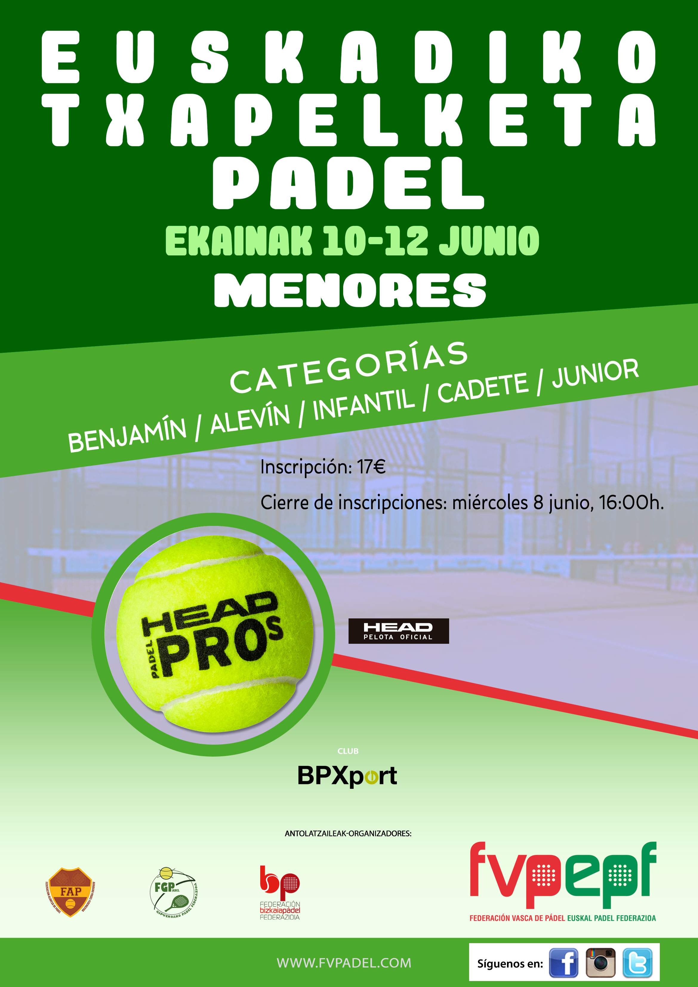 EUSKADIKO PADEL TXAPELKETA 2022 - MENORES/GAZTEAKInformación Adicional del TorneoCuadros publicados. Horarios a partir del jueves 9 a las 15:00h. Inicio de competición el sábado 11 de junio.Juez árbitro Pedro Etxarri tlf 688 81 51 59 (SOLO WHATSAPP)Mas info aquí...