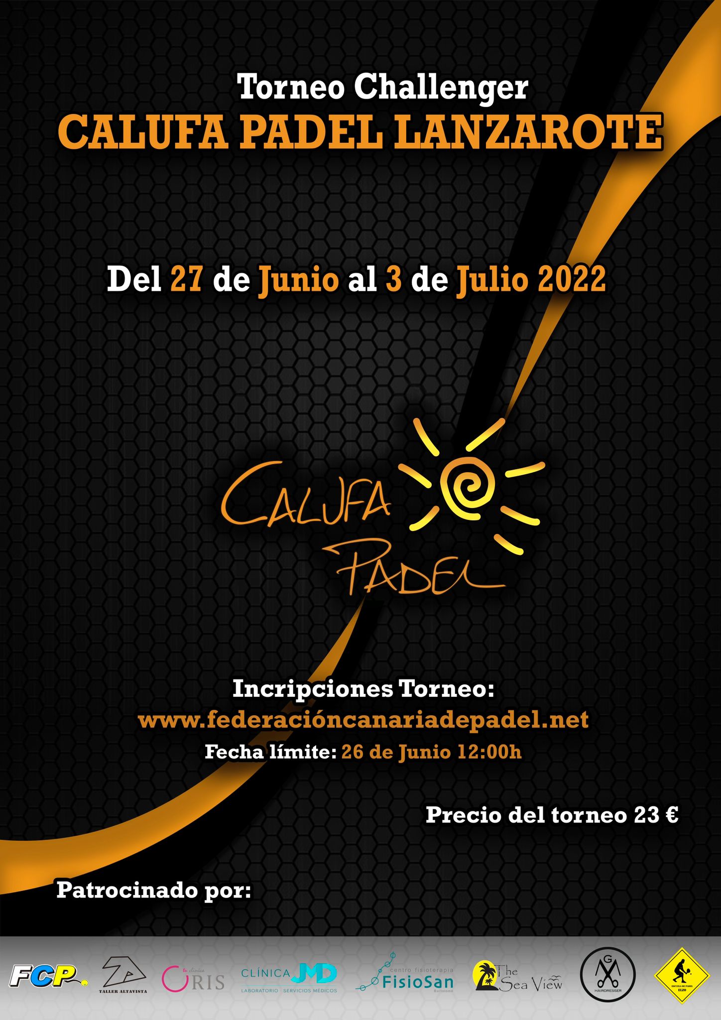 CHALLENGER CALUFA PADEL LANZAROTEFecha Tope de inscripción: domingo, 26 de junio de 2022 - 12:00Condiciones Inscripción:Pueden participar todos/as aquellos/as jugadores/as que ...